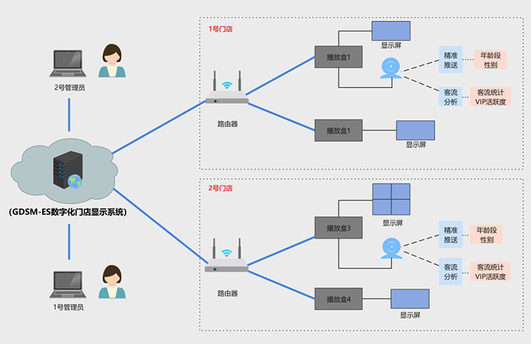 该客户为宁波地区零售门店,在一段时间内,客户发现门店销售额持续下滑,但是不知道原因出在哪里,到底是消费者减少,还是广告推送出现问题,亦或是其他原因,客户没有头绪,918博天堂(中国区)科技数据化门店显示系统完美的解决了客户痛点,方案拓扑图如下: