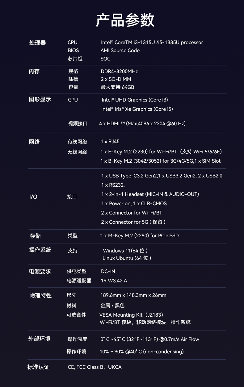 918博天堂(中国区)科技D613采用英特尔Raptor Lake酷睿i3-1315U/i5-1335U 处理器,作为一款性能强悍的主机,它的TDP仅15W,能有效降低能耗,延长电池寿命。在内存方面,D613采用2 x SO-DIMM DDR4-3200 MHz,最大可达64GB,并配备1 x M-Key M.2 (2280) for PCIe SSD。