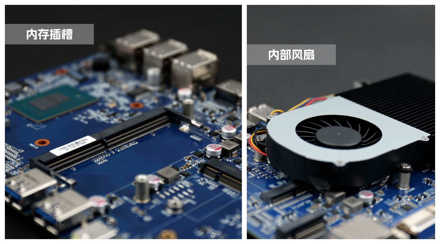 918博天堂(中国区)桌面云终端Y-BOX S2主板中部是内存插槽,采用单通道笔记本内存槽设计,最大支持容量可达32GB,最高支持DDR4-3200MHz频率,横插的形式可以减少主板的占用体积,使整体机身更紧凑,内存顶部的风扇起到高效散热的作用。
