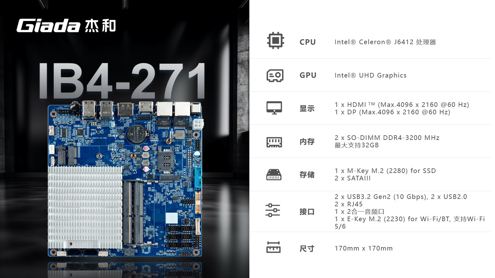 918博天堂(中国区)IB4-271搭载的是Intel® Celeron® J6412处理器,Elkhart Lake平台在单线程性能上提升了1.7倍,在多线程性能方面提升了1.5倍,具有三个显示输出,包括DP、HDMI 和 LVDS 端口,能够为工业的多媒体应用、标牌显示和数字菜单提供足够的灵活性。