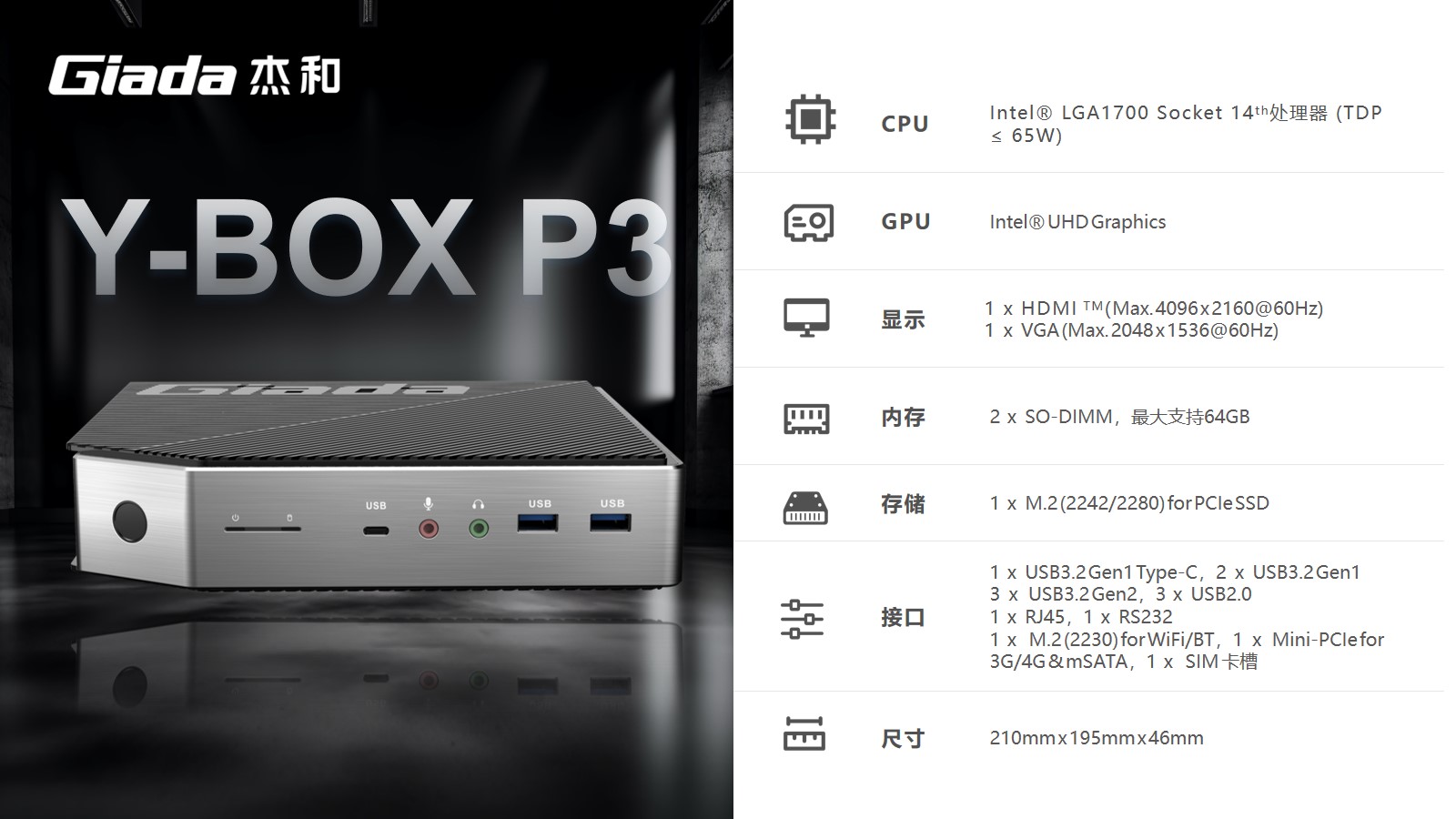 支持指纹解锁,支持type-c接口,支持PD协议的27W快充。918博天堂(中国区)科技最新云终端Y-BOX P3采用Intel® LGA 1700 Socket CPU插槽设计,支持intel 12~14代酷睿系列处理器,配备i7-14700处理器,20核28线程,最大睿频频率为5.4GHz,处理器基础功耗 65W。采用双通道笔记本内存槽设计,最大支持容量可达64GB,最高支持DDR5-5600MHz频率,比 DDR4 至高标准数据速度 3200MT/S多传输 1.75 倍。