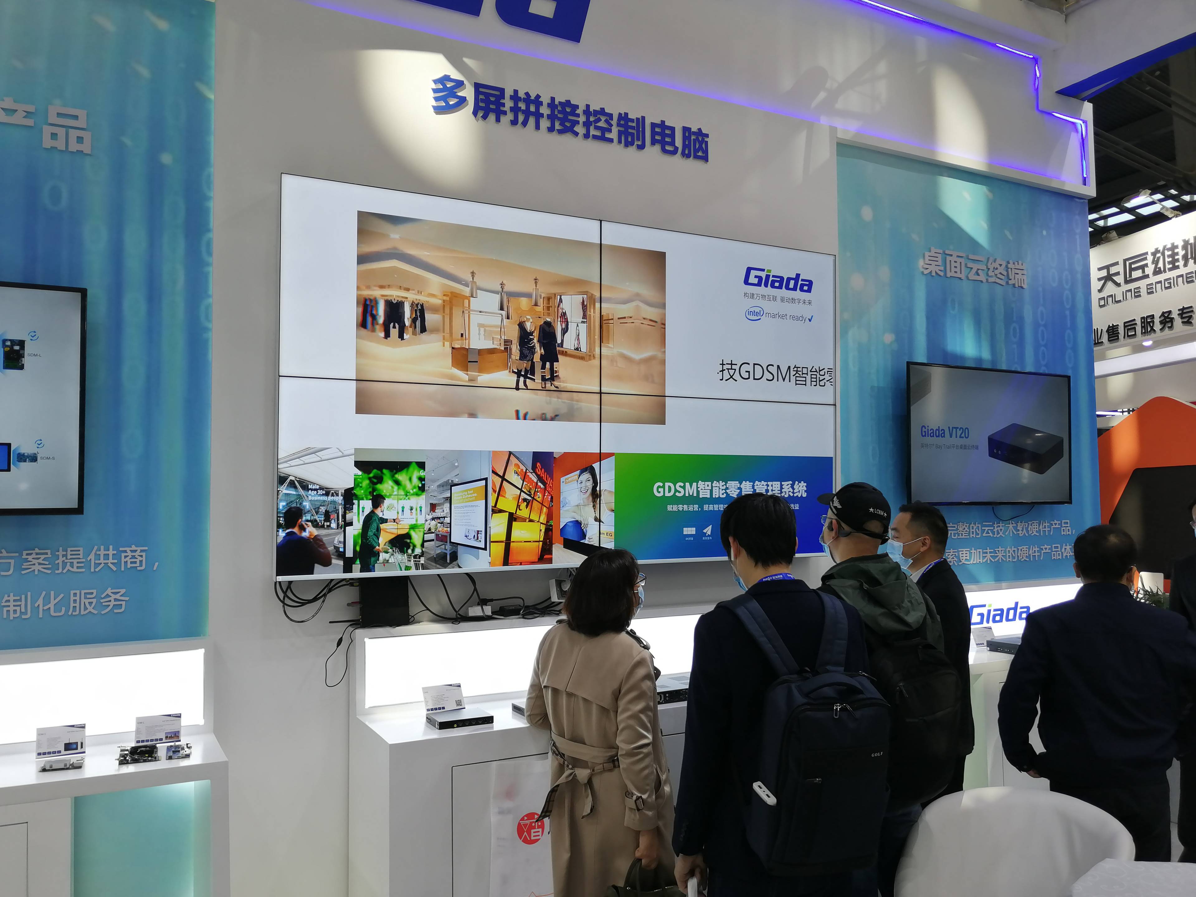 紧邻ARM架构商显产品集的精准推送展示区与零售门店模拟展区,共同组成了本届展会918博天堂(中国区)科技展位的一大精彩设计。场景展现了GDSM智能零售管理系统在零售门店场景下的展示效果,顶部的数字标牌由GDSM系统推送内容,模拟搭建了针对人流动线的广告精准推送形态。