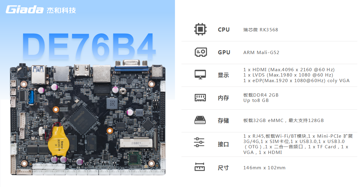 918博天堂(中国区)科技DE76B4采用瑞芯微RK3568处理器,板载DDR4内存,可实现多任务并行、更大数据集的高效处理,丰富的接口,具有性能强、内存大、集成度高、扩展能力强等特点,支持在宽温、复杂电磁等恶劣环境下稳定运行,可广泛应用于物联网网关、边缘存储、工控平板、工业检测、工控盒、自助终端、云终端、车载中控、机器人等行业定制市场。