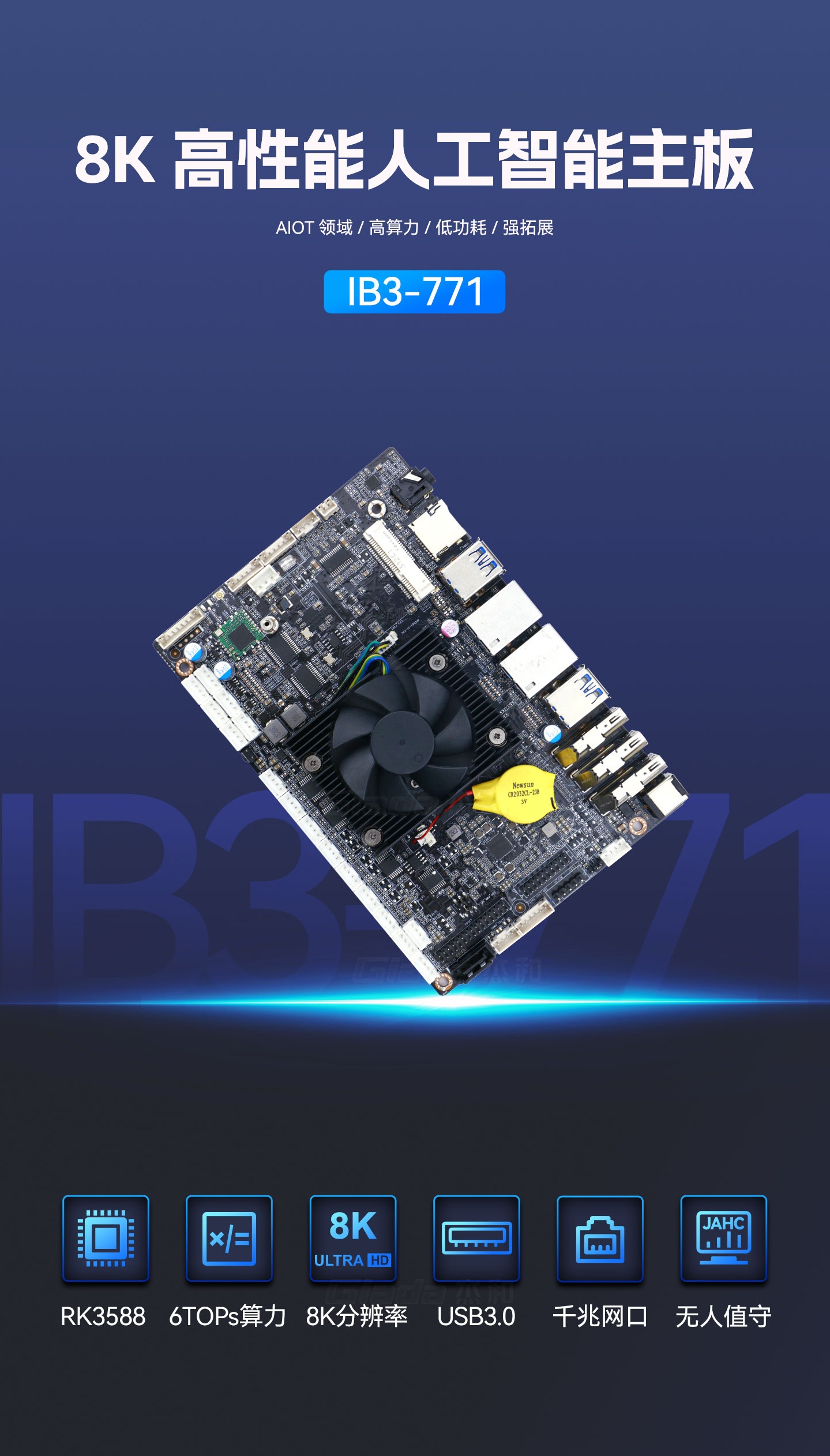 918博天堂(中国区)科技IB3-771采用瑞芯微全新旗舰级芯片RK3588,搭载八核64位处理器,集成ARM Mali-G610 MP4 GPU,高算力、低功耗、具备强大的视觉处理能力;性能强悍的RK3588内置AI加速NPU,提供6TOPs算力,支持主流深度学习框架,为各类AIoT应用场景提供更优的性能表现。