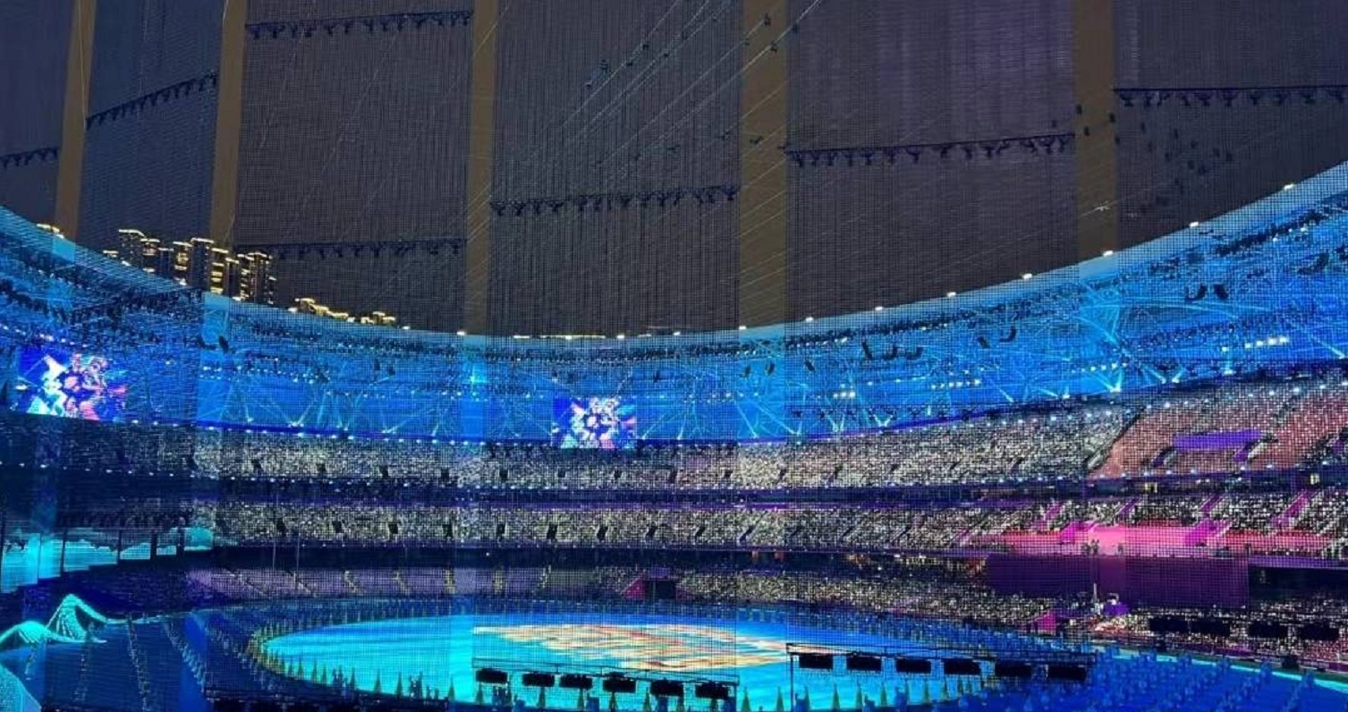 这是亚运会史上第一次“数字点火”,也是裸眼3D 技术、现实增强和人工智能技术的完美结合。虽然数字人在钱塘江上踏着浪花奔跑的画面是虚拟技术电脑制作而成,只能通过转播看到,但当数字人进入大莲花体育场,现场的观众能真切地看见他奔跑以及点燃火炬的画面。那数字巨人是如何“跑到”现场观众面前的呢?