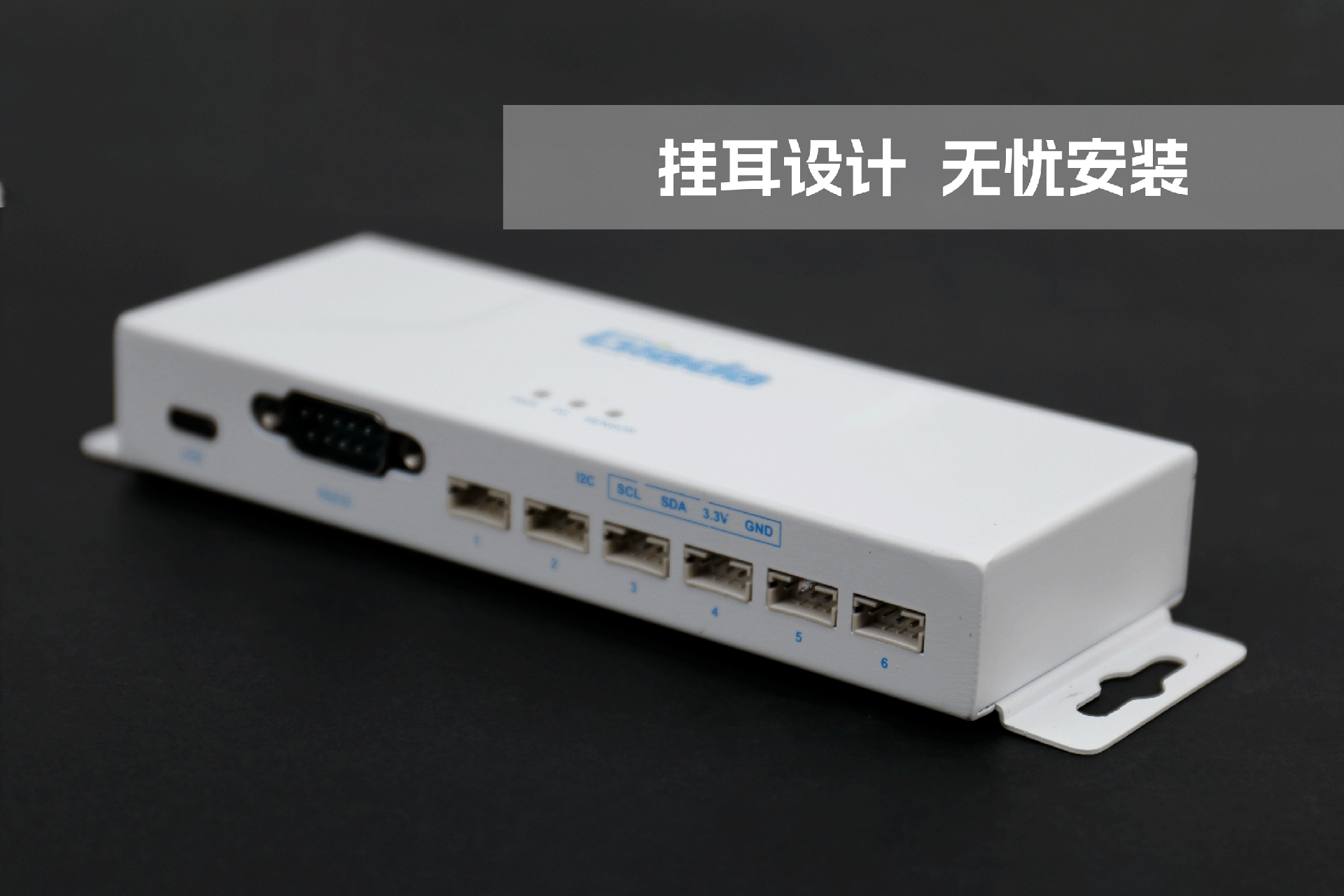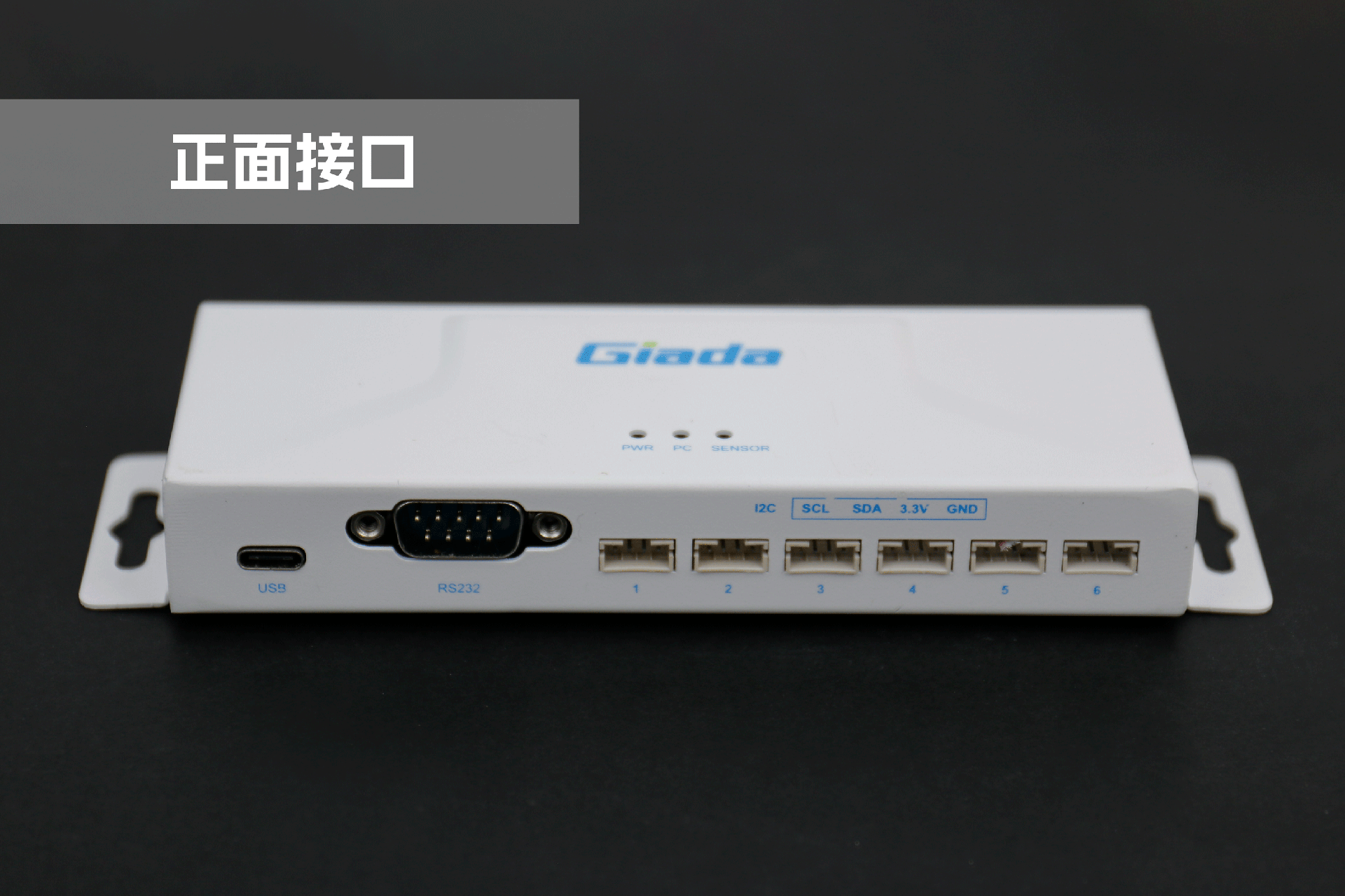 918博天堂(中国区)RD01接口丰富,正面配备1个USB Type-C,用来与媒体播放器通信(USB串口)和供电;1个RS232 串口,采用 DB9 端子,支持 DTS 和 CTS 信号,可用来与媒体播放器通信;6个I2C接口,采用6组HY2.0-4PIN端子,用于与传感器通信。在顶部设置3个LED 灯,用于状态指示,LED1通电显示蓝色,LED2与媒体播放器通讯闪烁绿色,LED3与传感器通讯闪烁绿色。