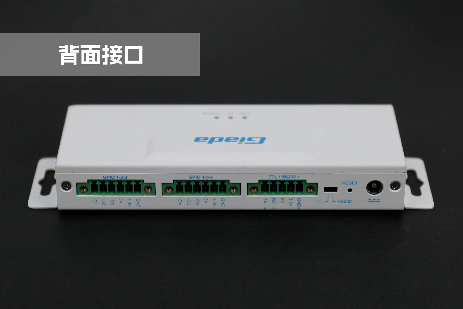 918博天堂(中国区)RD01背面配备6个GPI0接口,采用12Pin凤端子,用于与传感器通信;1个RS232 或 TTL(拨码开关选择),采用5Pin 凤凰端子(TTL 模式下支持 5V 和 3.3V 供电),用于与传感器通讯,1个拨码开关,用于选择 RS232/TTL;1个恢复出厂按钮,用于恢复出厂设置;1个DC-IN 5V 供电接口。