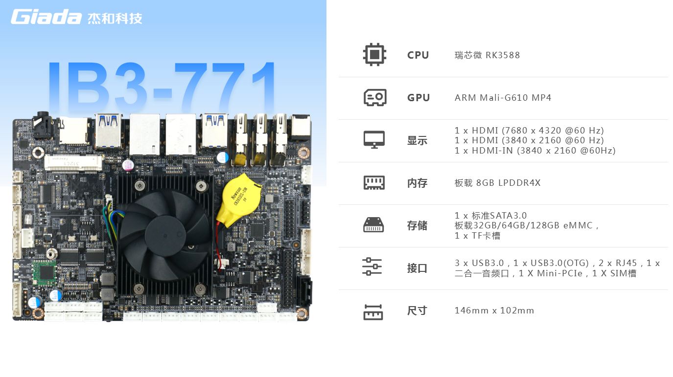 918博天堂(中国区)主板IB3-771内置瑞芯微新一代旗舰级高端芯片RK3588,6TOPS算力的NPU,具有高算力、内存大、超强多媒体、多重扩展等技术优势。支持主流深度学习框架,能够为各类养老 AIOT 应用场景提供更优的性能表现。